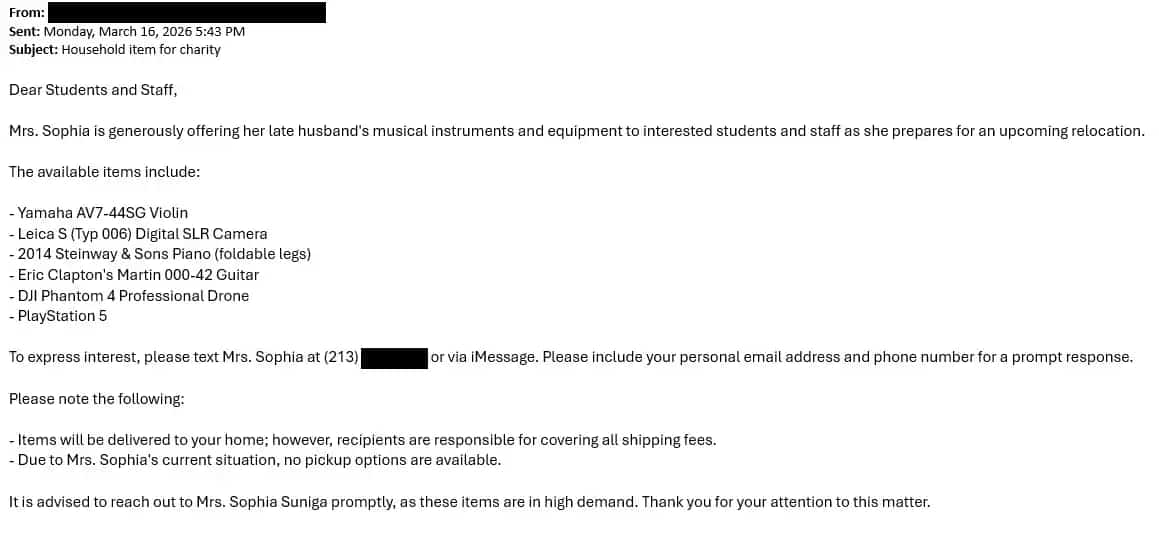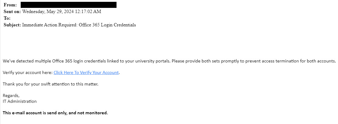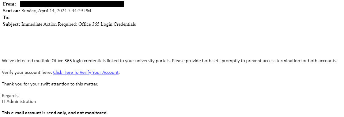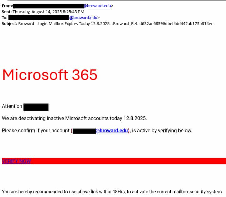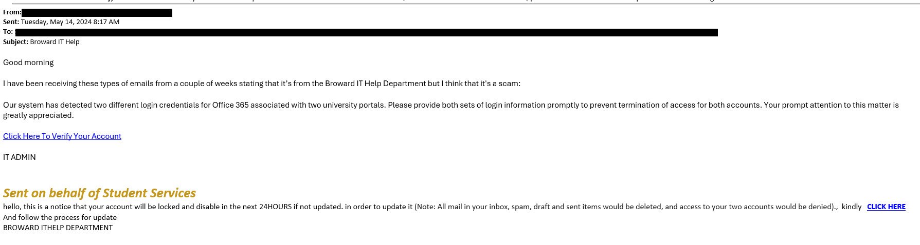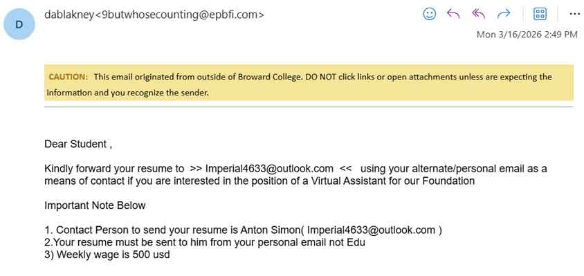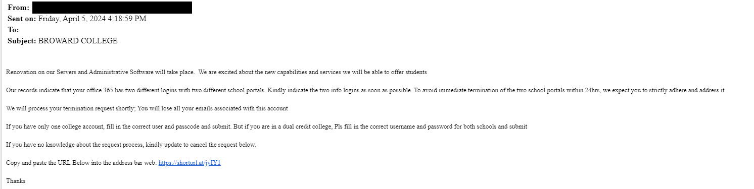 Screenshots of actual phishing messages targeting Broward College.